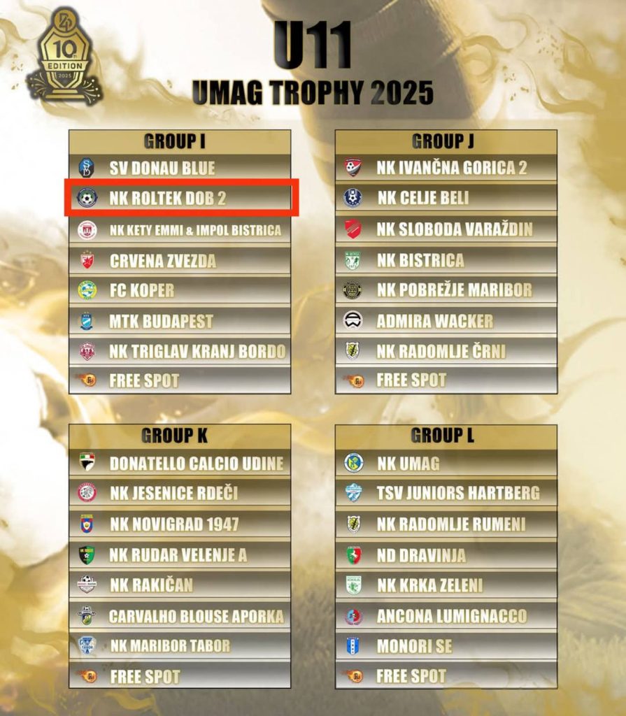 Pohvala in zahvala strokovnemu štabu naše selekcije U11 NK Roltek DOB ter staršem naših nogometašev in ekipi B4 Slovenia za super organizirano gostovanje in najboljše navijanje na vedno prestižnem UMAG TROPHY 2025.